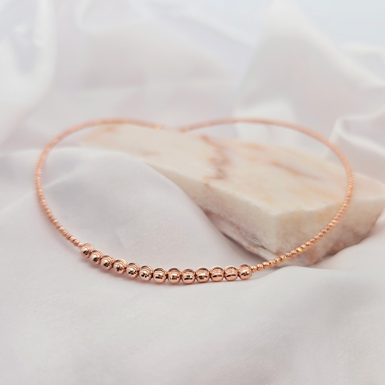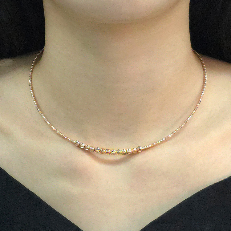 로즈볼이 정면에 라인처럼 배열되어 목선을 따라 은은하게 빛나는 우아한