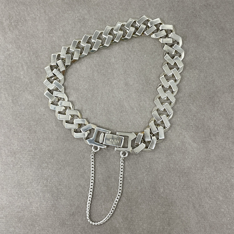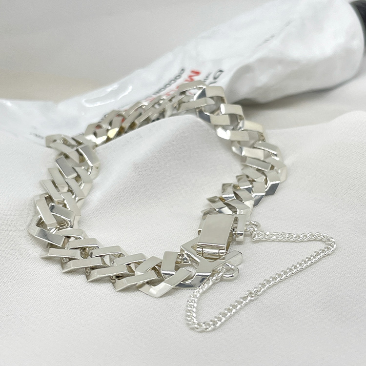 디테일한 연결 방식이 차분하면서도 강한 개성을 표현하기 좋으며 보조줄이 장금장치에 연결되어 있어 분실의 염려가 없는 팔찌입니다.