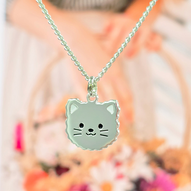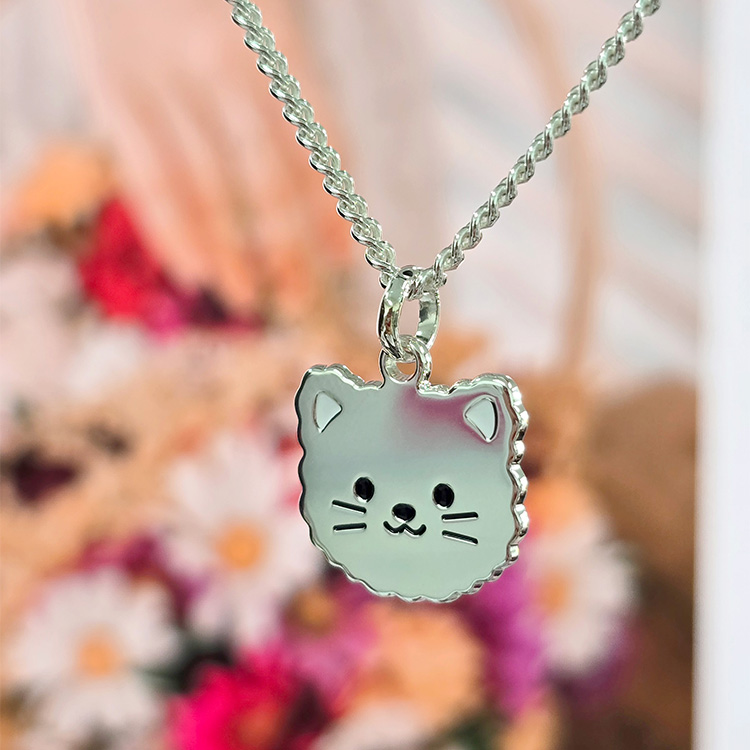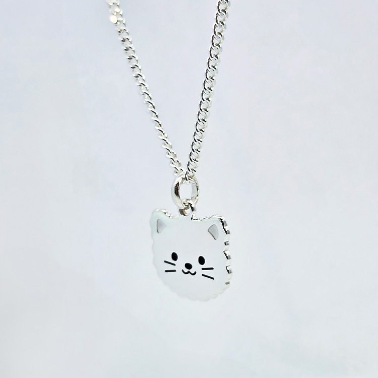 복실한 털과 둥근 얼굴이 귀여운 고양이 얼굴 유아 목걸이입니다.