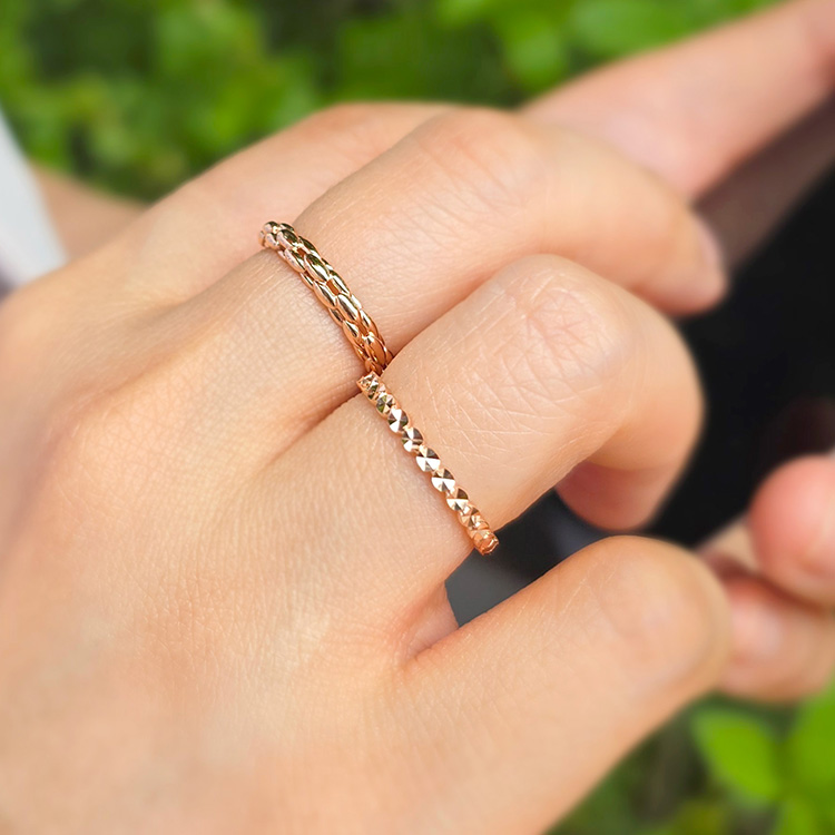 작고 섬세한 타원들이 교차하며 유니크하면서도 고급스러운 패턴이 돋보이는 개성있는 반지입니다.